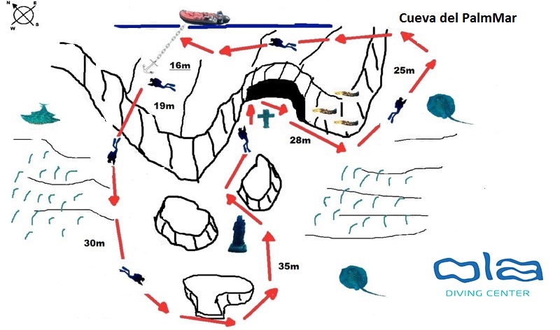 Ein bekannter Tauchplatz in der Höhle von Palm Mar ist ein Plateau, das sich in 15 bis 17 Metern Tiefe befindet. In 27 Metern Tiefe befindet sich der Eingang der Höhle, in dessen Nähe ein Kruzifix und eine Statue der Jungfrau mit dem Kind in ihren Armen stehen. Sie wird angerufen, um die Fischer zu segnen, die vom Hafen von Los Cristianos aus aufs Meer hinausfahren. Die Höhle mit mehreren Galerien befindet sich in einer Tiefe von 16 bis 38 Metern. Die gesamte Wand ist mit kleinen, von Muränen bewohnten Löchern bedeckt. Rund um die Höhle kann man die felsige Formation des Sandbodens sehen, die sich allmählich in die Tiefe erstreckt. Im Winter wird die Höhle von atlantischen Stachelrochen zur Paarung aufgesucht. Sichtweite: 30-40 Meter.